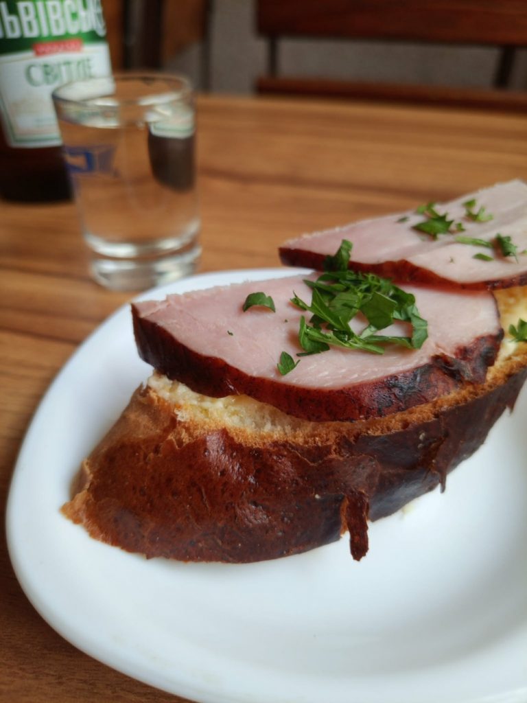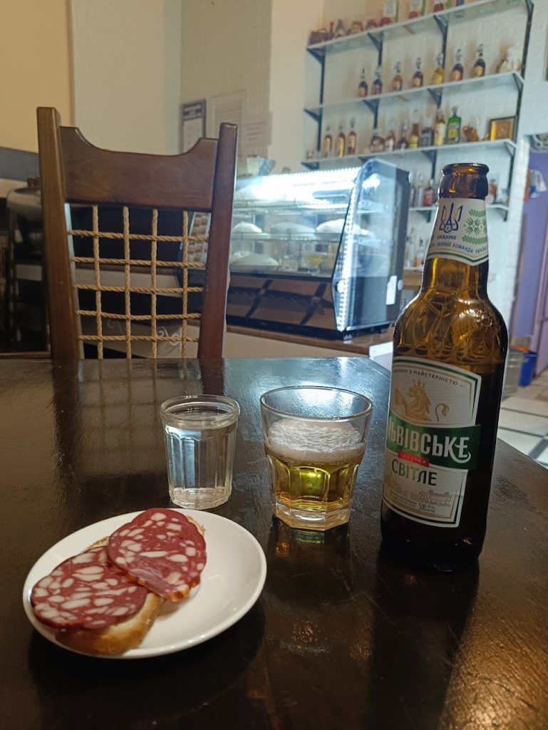 Jdeš si po stometrovce, hlavní Lvovské promenádě, prosmýkneš se podchodem, zakašleš z množství prachu, které tady občas je a štípe do očí, zahneš doprava – a aha! Kafe vedle restoránu francúzské kaníkuly. Chlebíčky, horilka pervak, plechovkové Lvovské, samozřejmě rajčatový džus, vysoký třímetrový strop, stolky, barovky u kasy. Je druhý den mé návštěvy na jaře 2023 a vidím krásně vyrovnané chlebíčky v chlazeném pultu.
