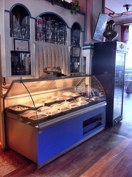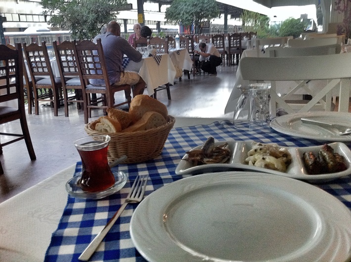 „Pane, tady jsou všude rezervace,“ vysvětluje vrchní, když se mi s ním konečně podaří navázat oční kontakt. „Musíte si přesednout až támhle dozadu,“ ukazuje až skoro před veřejné záchodky. Dobře, dobře, ale co teda k jídlu? „Pojďte se podívat do ledničky, máme tam meze,“ objasňuje nabídku tradičních tureckých alkoholických příkrmů, z nichž se vhodnou kombinací může stát plnohodnotné hlavní jídlo. Nic teplého vyjma nápojů ovšem nečekejte. Kopíruju výběr zuřivě telefonujícího pána o dva stoly vedle a poroučím si ančovičky v oleji, nakládaného mořského okouna nakyselo, sarmu a čaj. Za celou večeři včetně couvertu platím 48 lir (461 Kč), což je při vzpomínce na předražené pivo vlastně ještě jakž takž ucházející cena.