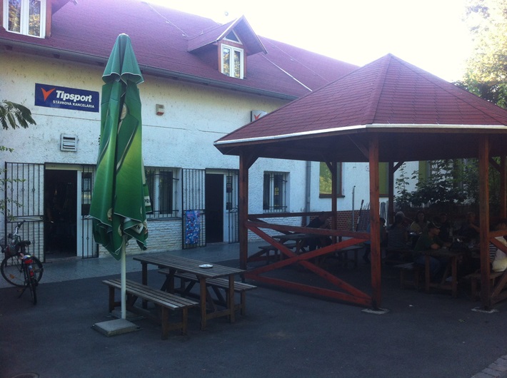 Cestou se může návštěvník se slzou v oku zadívat na druhý břeh do zbytkových Uher na již zmíněnou horu Magas-hegy i s kalvárií. Brzy však stane před budovou omšelého pensionu, nyní herny a nálevny. Čidlo pohybu jej uvítá laskavým: „Tuduuuuu, tuduuuu, tuduuuu.“ Celé osazenstvo se pak obrátí na nového návštěvníka, změří si jej a pak se opět věnuje „svým činnostem“. Konzumaci borovičky, piva, hře v automaty, atd. Uvnitř je šero a lepkavo. Exteriér i interiér odkazují na architektonické bezčasí devadesátých let. Zahnědlý plastikový nábytek v interiéru dokresluje atmosféru útulnosti.