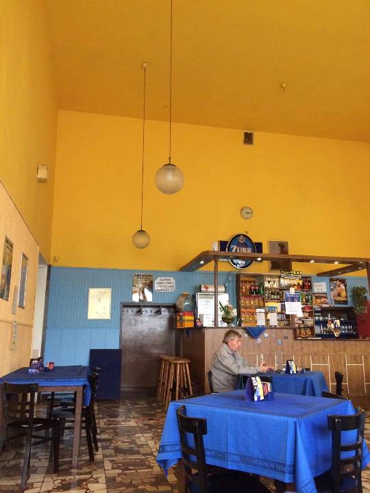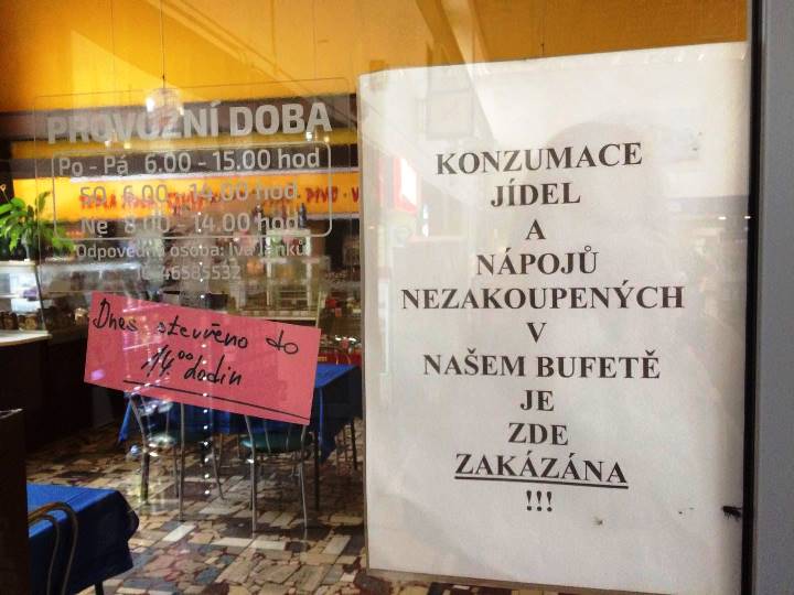 Dozvídám se tak, že menýčka jsou během týdne do 14 hodin, v sobotu pak jen do 12. „Záleží, jak je tu šéf. Ten dělá guláš a pečené maso.“ Vzhledem k tomu, že většinu osazenstva tvoří místní dělňasi, kteří chodí do práce na 4 a končí před polednem, není se co divit. Přespolní má holt smůlu, odpoledne na něj čeká už jen zmíněný kus salámu se zelím a rohlíkem (!) za 4 pětky. Ani s tekutou částí nabídky to není zrovna slavné. „Bolí mě v krku – slivovicu máte?“ ptám se s úsměvem a udržuju tak přátelskou atmosféru. „Vodku a rum,“ uzemňuje mě žena. Objednávám raději malinovku a dostávám chuť na kávu, ale odrazuje mě konverzace servírky a nově příchozího štamgasta. „Co si dáš?“ – „Kafe.“ – „Pokusim se.“